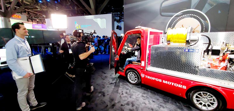 A Tropos Motors electric fire response vehicle is displayed at a Panasonic news conference during the 2020 CES in Las Vegas