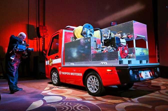 A Tropos Motors electric fire truck is on display during a Panasonic news conference before the CES tech show, Monday, Jan. 6, 2020, in Las Vegas. (AP Photo/John Locher)