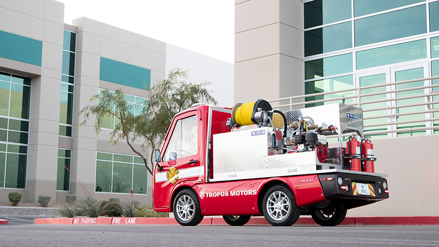 According to Panasonic, a full-sized fire truck could cost as much as $500,000, but the Tropos FRV fire truck is one-tenth of the cost and offers similar capabilities. In fact, these trucks have a footprint that fit on the width of a typical cart path. Due to its smaller stature, this fire truck is able to access emergency situations with tighter spaces and can even fit underneath most parking structure height restrictions.