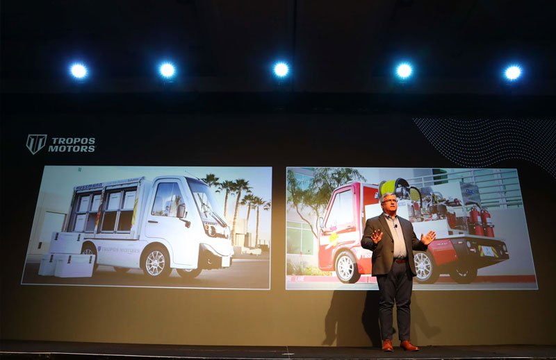 During the annual CES event last week in Las Vegas, Tropos displayed a last-mile delivery vehicle and compact fire truck at Panasonic’s massive exhibit booth.